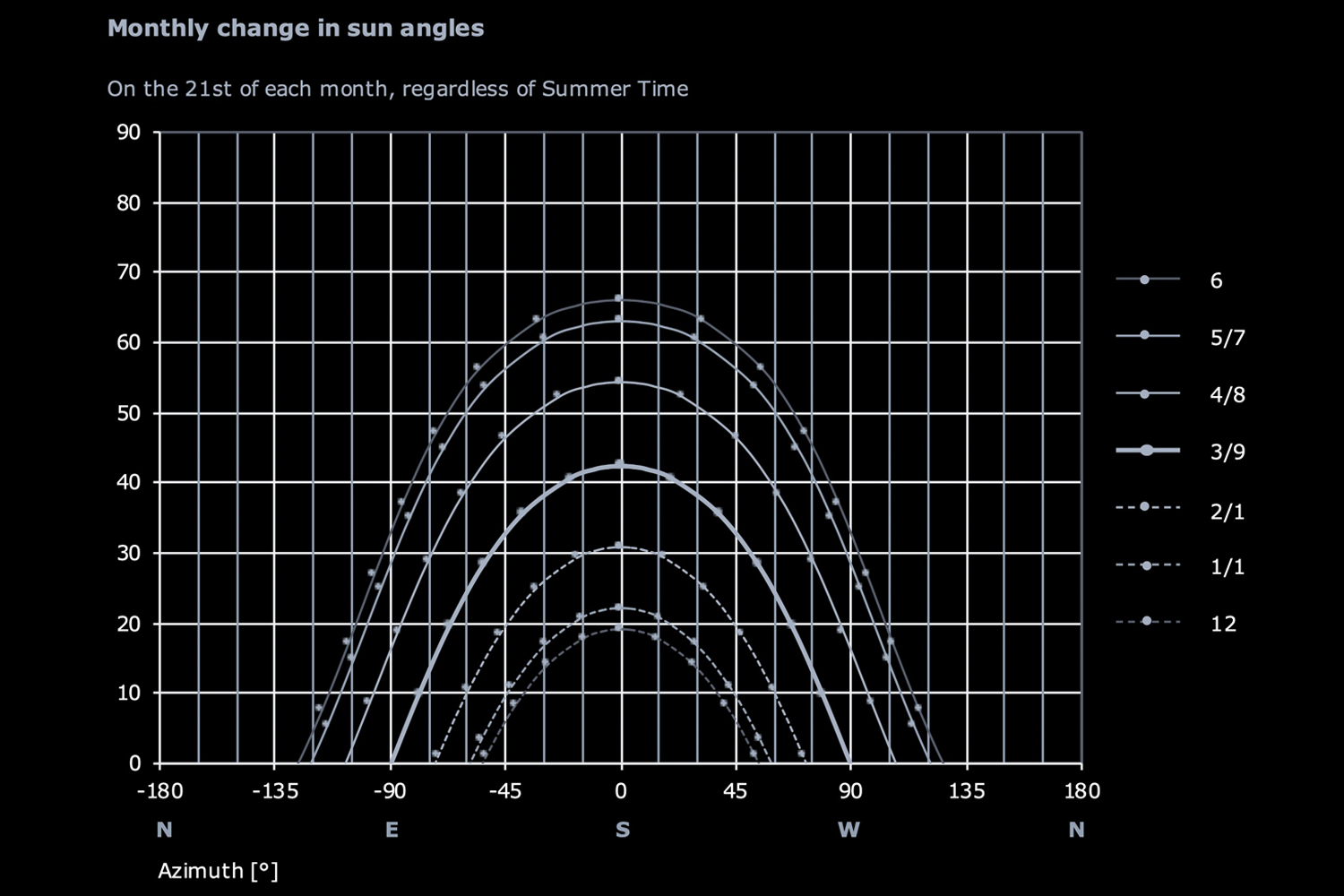 Die Tabelle Sonnenwinkel berechnet die monatlichen und tageszeitlichen Veränderungen der Sonnenposition anhand der geografischen Breite. Sie ermittelt die Sonnenhöhe in Bezug auf Azimut und Tageszeit und hilft so bei der Tageslichtnutzung, Verschattung und passivem Solardesign.