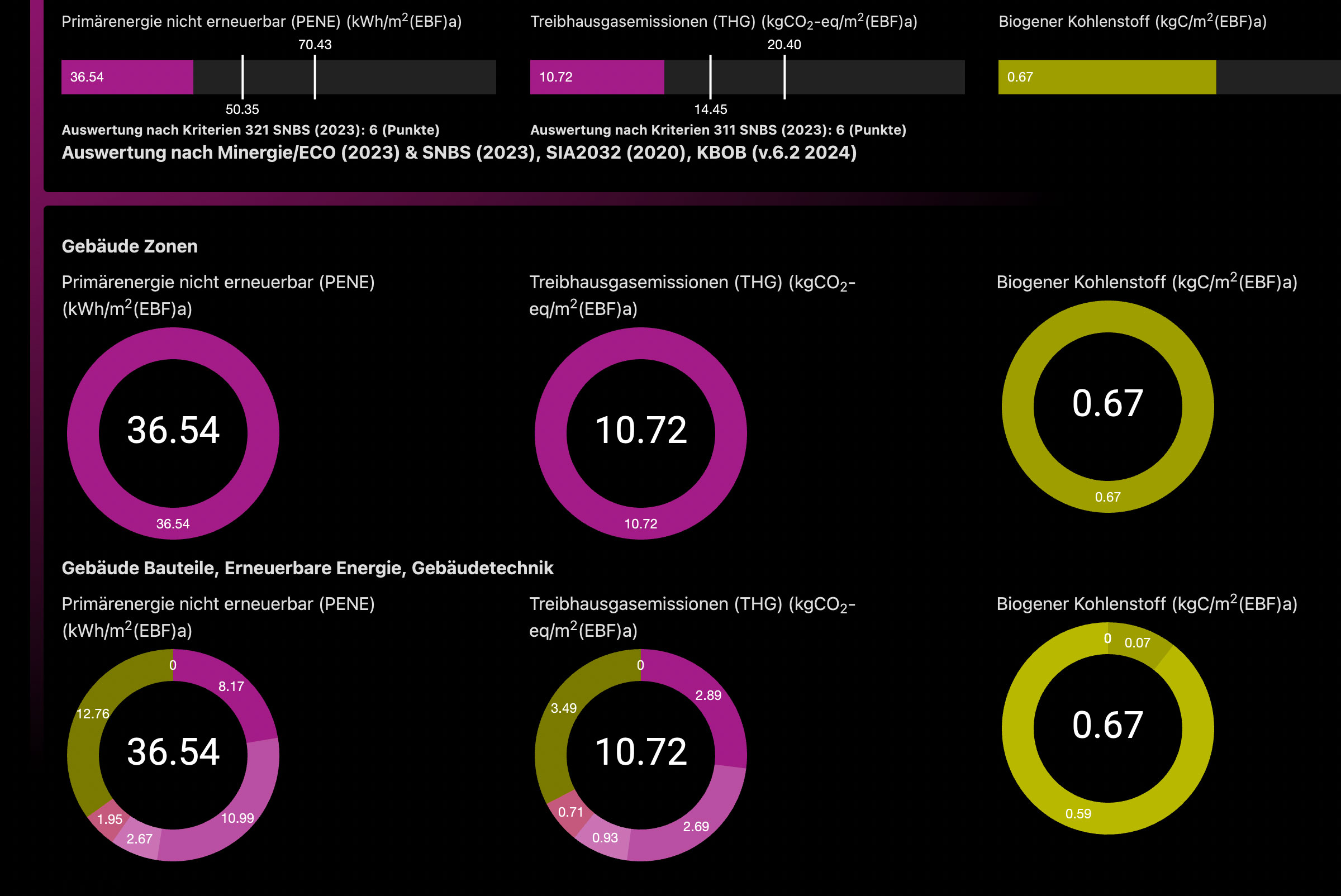 Die Plattform ermöglicht eine umfassende Analyse der Treibhausgasemissionen in den Bereichen Bau, Betrieb und Mobilität. Sie unterstützt Strategien der Kreislaufwirtschaft durch Materialwiederverwendung, Recycling und Ökobilanzierung unter Verwendung einer umfangreichen Materialdatenbank. viride gewährleistet auch die Übereinstimmung mit wichtigen Schweizer Vorschriften und Nachhaltigkeitsstandards, darunter KBOB, SIA2032, SIA2040, SIA390/1, SIA380/1, SIA2024, SIA2039, Minergie-P-A/ECO, und SNBS.