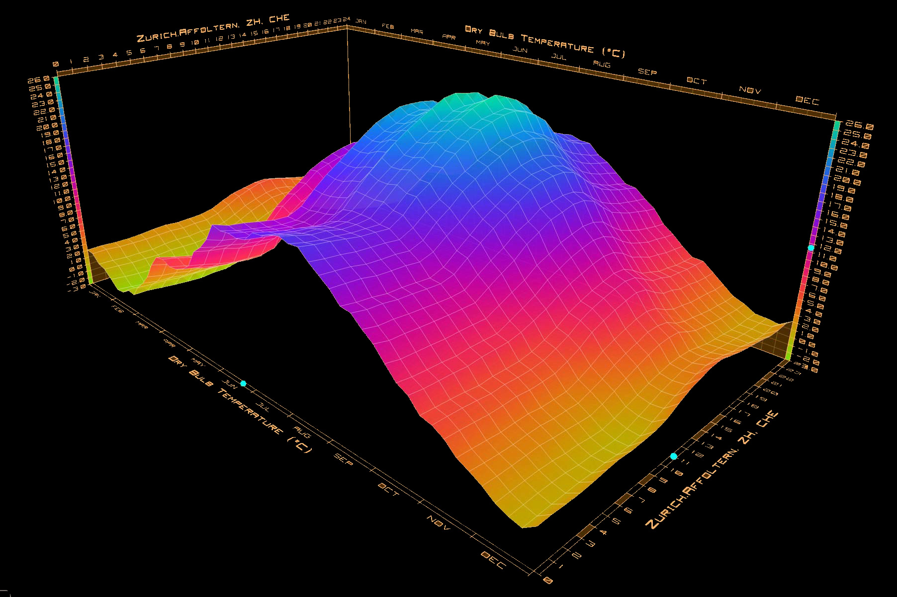 Die gemessene Mindesttemperatur liegt bei -6,1 °C im Dezember, während die Höchsttemperatur 34,6 °C im August erreicht. Temperaturen unter 0 °C treten im Winter nur an wenigen Tagen auf, während der Rest des Jahres relativ mild bleibt. Mit dem Klimawandel gewinnt der Kühlbedarf zunehmend an Bedeutung und wird eine größere Rolle bei der Planung zukünftiger Gebäude spielen.