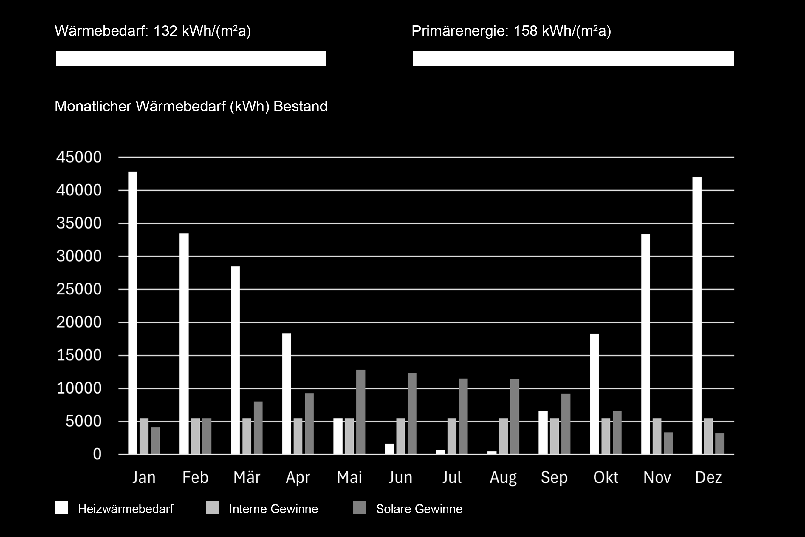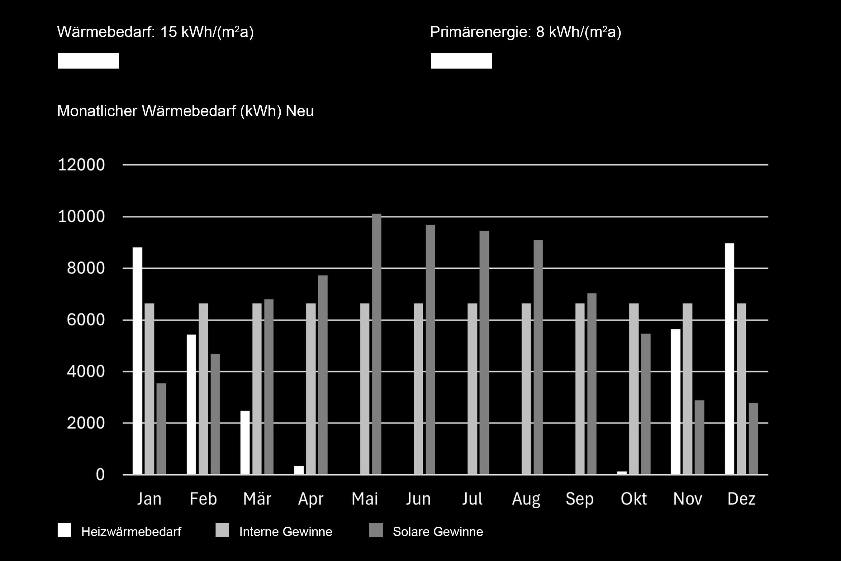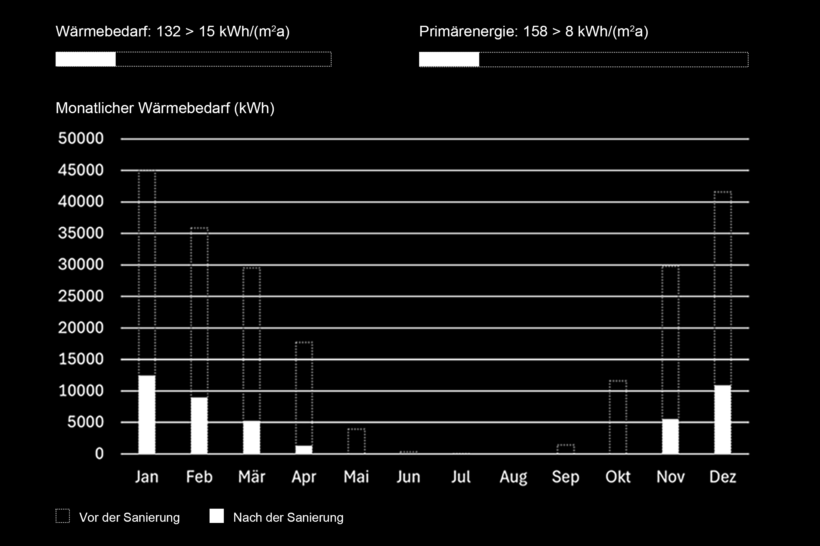 Die Simulationsergebnisse zeigen, dass die Sanierungsmassnahmen zu einer ausserordentlich hohen Energieeinsparung führen. Der spezifische Heizwärmebedarf sinkt von 132 kWh/m²a auf 15 kWh/m²a, was einer Reduktion um rund 89 % entspricht. Auch der Primärenergieverbrauch verringert sich deutlich – von 158 kWh/m²a auf lediglich 8 kWh/m²a, also um etwa 95 %. Diese Werte verdeutlichen, wie stark die Erneuerung der Gebäudehülle und der Wechsel des Heizsystems auf eine Wärmepumpe die energetische Gesamtleistung des Gebäudes verbessern können.